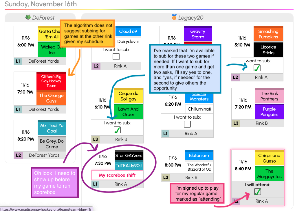 Double check locations and timing of your games, especially if you are subbing! You can sign up to sub or mark yourself absent before 8am Sunday morning to make sure you’re included in the subbing algorithm. Google Maps alleges that it takes 30 minutes to drive between rinks, so plan accordingly if you want to play in games in both locations!