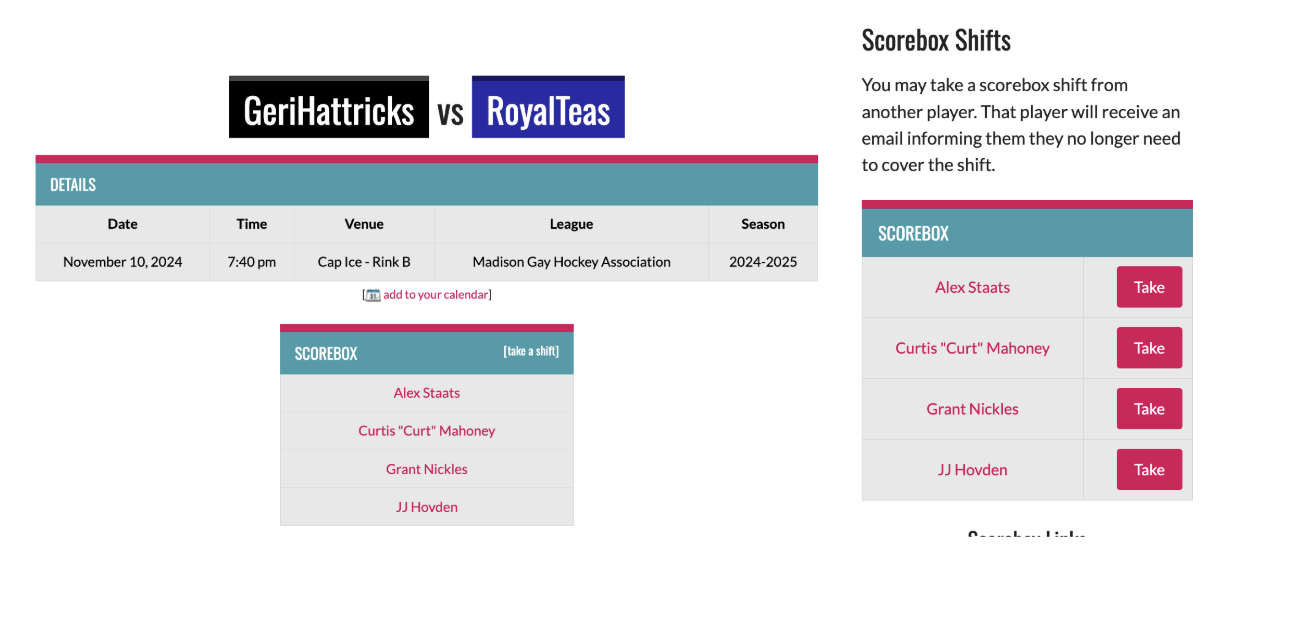 On each game night, you’ll see if you have a shift – a reminder about scorebox will go out on Wednesday. Shifts are auto-assigned based on your game time, then updated based on reported availability and individual shift trading.